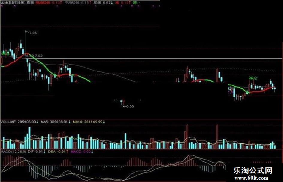 中趋势线:MA(CLOSE,55),LINETHICK1,COLORGRAY;