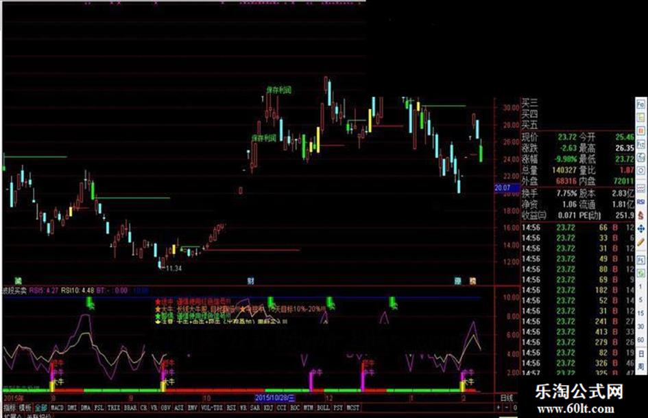 DRAWTEXT(卖出条件 AND D2>=23 AND D2<27,HIGH*1.13,'↙赚25%'),colorred;