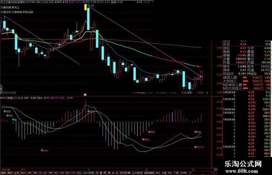 DRAWTEXT(D1>0,HHV(DIF,60)*0.85,'..MACD'),COLORFFCC00;{MACD顶背离}