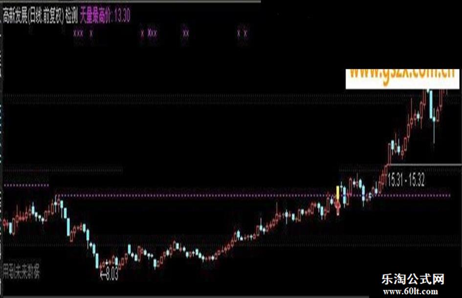 天量最高价:DRAWLINE(HT=0,REF(H,HT),HT1=0,REF(H,HT),1),DOTLINE,COLORMAGENTA;