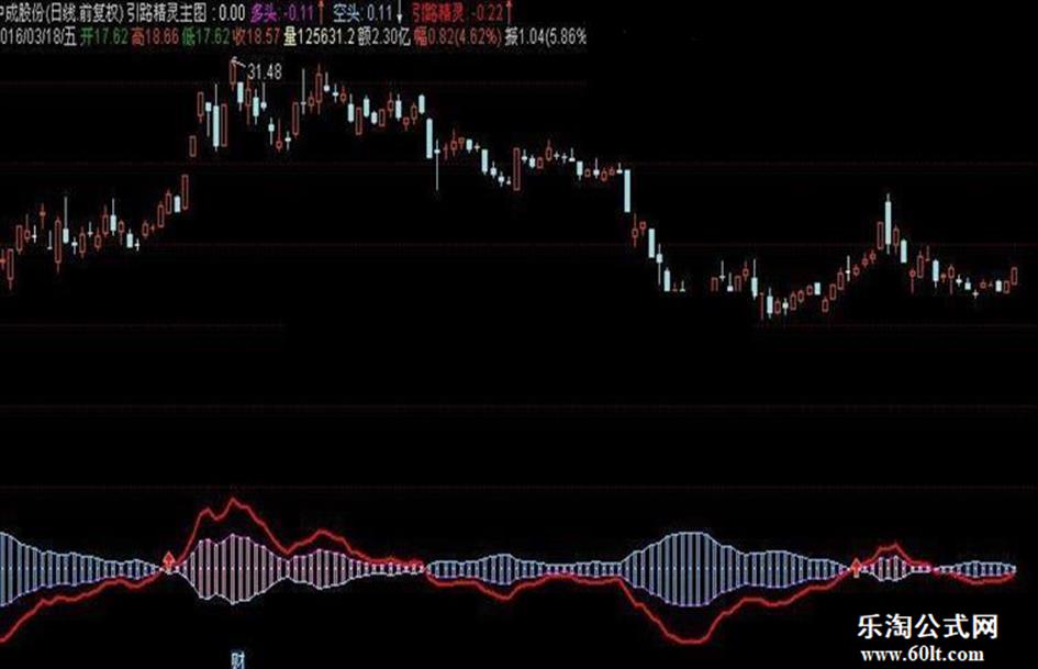 {引路精灵 } 空方:=(EMA(CLOSE,24)-EMA(CLOSE,4))/2*0.95; 0,COLORWHITE,POINTDOT,LINETHICK2; 多方:=(EMA(CLOSE,4)-EMA(CLOSE,24))/2*0.95; 多头:多方,COLORFF00FF; 空头:空方,,COLORFFCC66; 引路精灵:(多方-空方),COLORRED,LINETHICK2; STICKLINE(多方>空方 ,0,多方 ,0.8 , 1),COLOREEAAFE; STICKLINE(空方>多方 ,0,空方 ,0.8 , 1),COLORFFCC66; STICKLINE(多方>空方 ,0 ,空方 ,0.8 , 1),COLOREEAAFE; STICKLINE(空方>多方,0 ,多方 ,0.8 , 1),COLORFFCC66; DRAWICON(CROSS(引路精灵 ,0 ) ,引路精灵 ,1 );