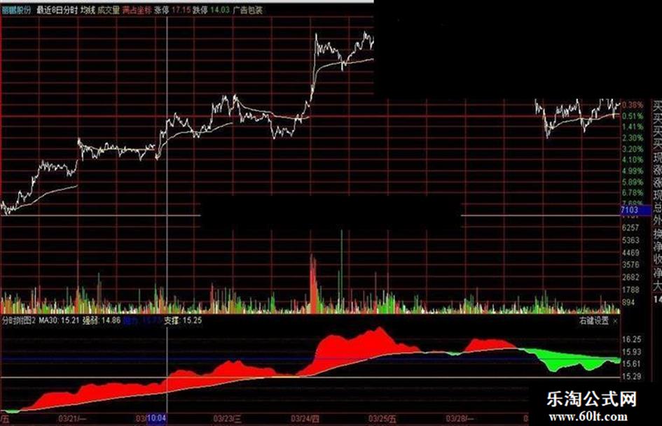 红色区域表示持股,绿色持币。 如3月18号开始翻红可以介入,3月24号红色区域大于蓝色阻力线则会出现冲高可减仓。在3月25号红色区域有过翻绿那么隔天就是最后一冲一定离场。注意本指标最好用6天以上周期准