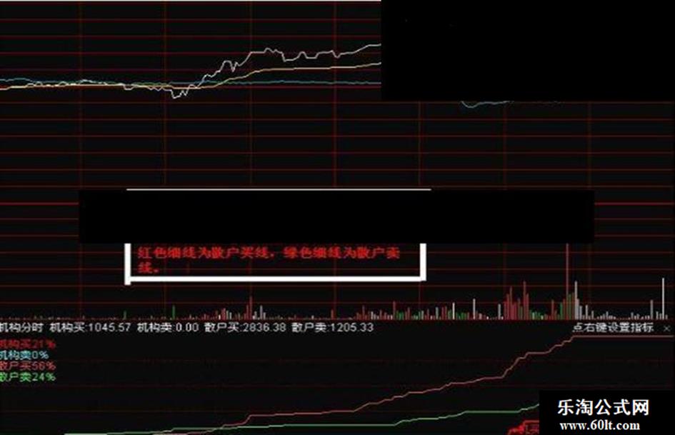 1.指标图左上部按线条颜色用文本标出了机构买、机构卖、散户买和散户卖的百分占比。图中红色粗线为机构买线,天蓝色粗线为机构卖线,红色细线为散户买线,绿色细线为散户卖线。