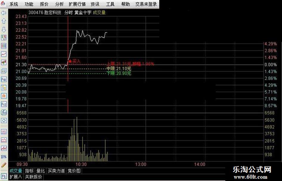 DRAWTEXT(C1/C2<=1.03 AND CROSS(C,C1) AND V>=VV,C1*1.005,'★买入')COLORRED;