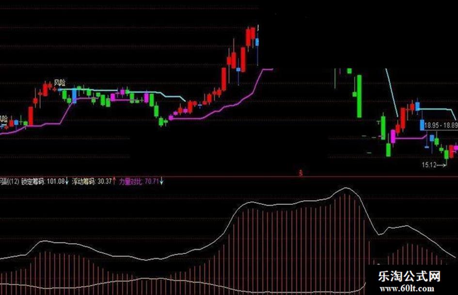 {筹码分析} HSL:=EMA(VOL/CAPITAL,3); ZDL:=HHV(HSL,240); ZXL:=LLV(HSL,240); XS:=MA(C,33); 锁定筹码:EMA((HSL-ZXL)/ZXL*XS,13); 浮动筹码:EMA((ZDL-HSL)/HSL*XS,13); 力量对比:锁定筹码-浮动筹码 ,COLORSTICK;