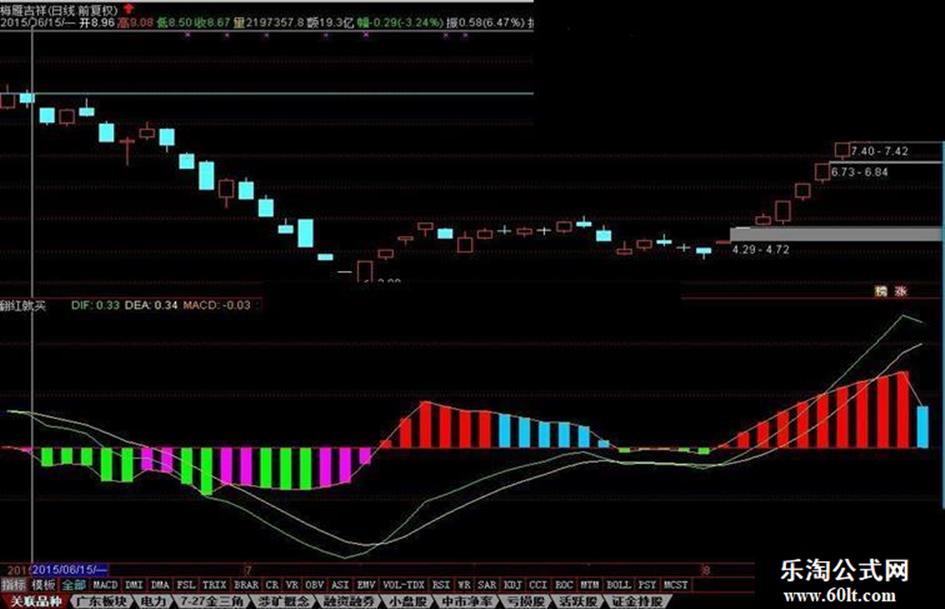 STICKLINE(MACD1>MACD2 AND MACD1<0,0,MACD1,2,0),COLORMAGENTA;