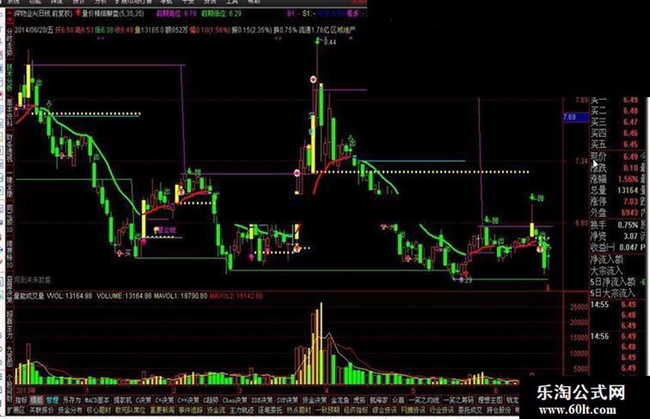 (2)、量柱图,黄色柱是倍量柱,白色柱是平量柱,绿色柱是21日内的低量柱,洋红色柱是55日内的低量柱。