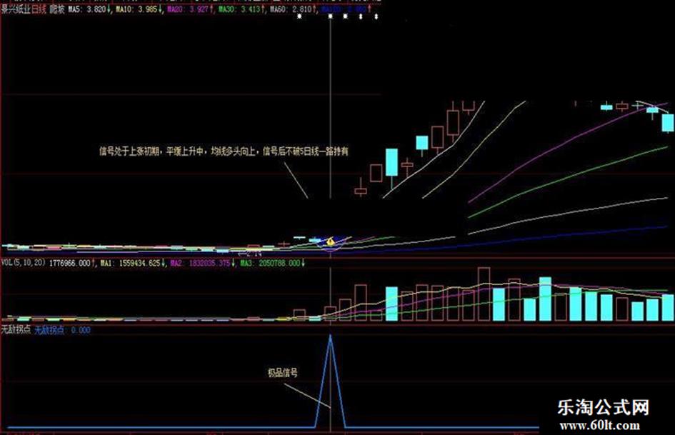 1、信号出现在上涨初期或上涨中途,各均线多头向上,平缓上升中,均线比较流畅,各均线之间的间距比较均匀的,没有特大特小的间距。