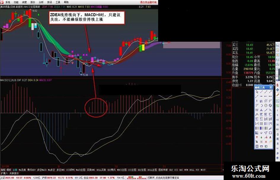 MACD试盘:IF((ZDEA/REF(ZDEA,1)-1)*1000<-10 AND ZDIF>ZDEA,1,0),COLORFF00FF,NODRAW;