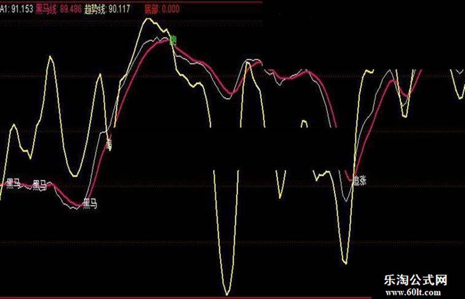 DRAWTEXT(CROSS(黑马线,A5)AND 趋势线<80,黑马线,'追涨');