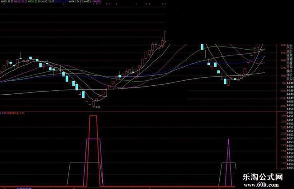 中线买:IF(绝佳买点>10000 AND 绝佳买点>20000,2,0),COLORFF00FF,LINETHICK2;