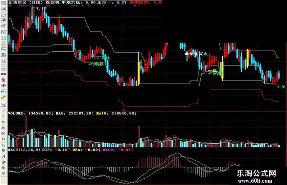 DRAWTEXT((((((((CLOSE - REF(HIGH,1)) > 0)) AND ((中线 - REF(中线,1)) > 0)) AND (HIGH <= 压力一)) AND (CLOSE < MA20)) AND (LOW <= 中线)),(LOW - 0.06),'←关注'),COLOR00FF00;