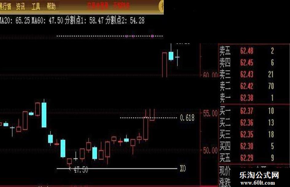 分割点1:IF(CURRBARSCOUNT<=10,高J-(高J-低J)*0.382,DRAWNULL),COLORWHITE,DOTLINE;