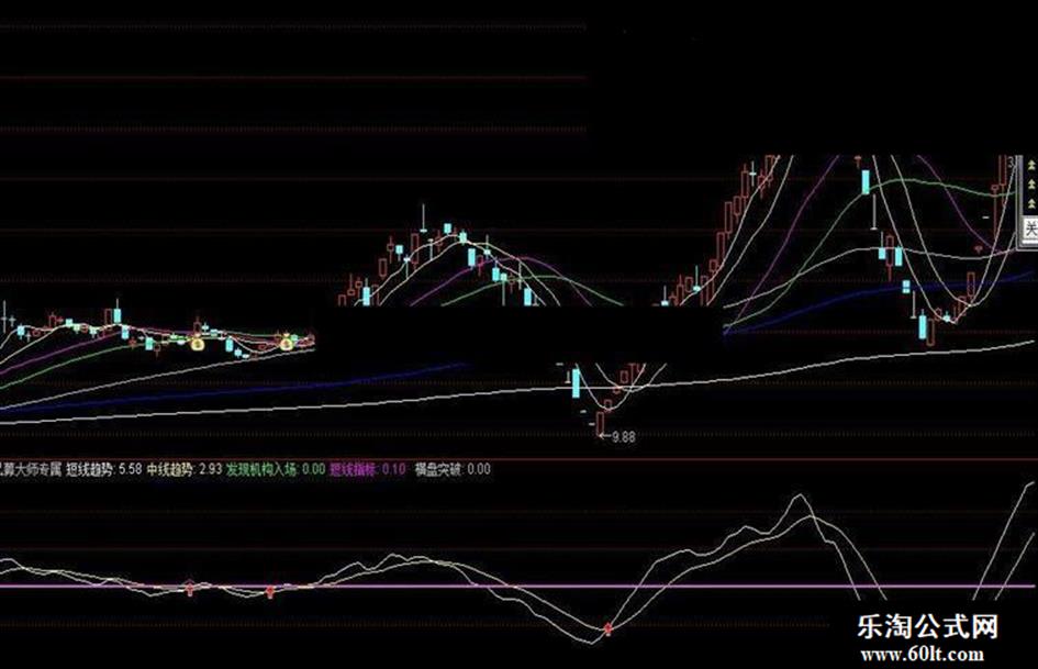 短线指标:IF(((((CROSS(短线趋势,中线趋势) AND (短线趋势 < 0)) AND (中线趋势 < (0 - 0.2)+4)) AND (VAR11 > 45)) AND (VAR16 > 0)),0.4,0.1),COLORMAGENTA;