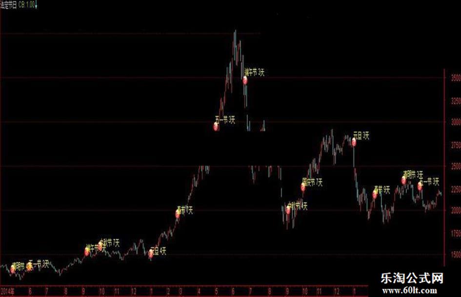 刚给朋友写的,他要观察节假日前后的历史行情。只是让我在日K线图上把每个节日标记出来。在通达信上写的,很简单。现发到这里,供有兴趣者参考。