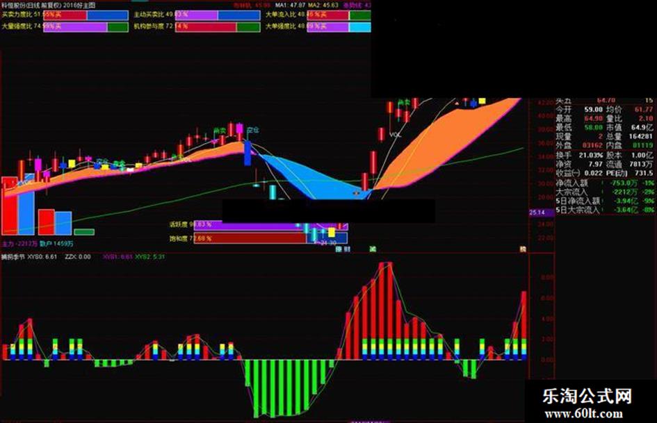 可以看到买卖力度、大单流入力度、资金流入力度、活跃度和饱和度,可能需要L2数据,是个好主图,