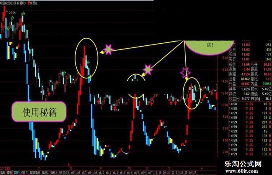STICKLINE(量1 >= 量2,量3,量1,0.1,0),COLOR0000FF;