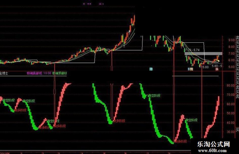 DRAWTEXT(CROSS(K,D) AND MA(CLOSE,5)<CLOSE,D,'做多阶段'),COLORRED;