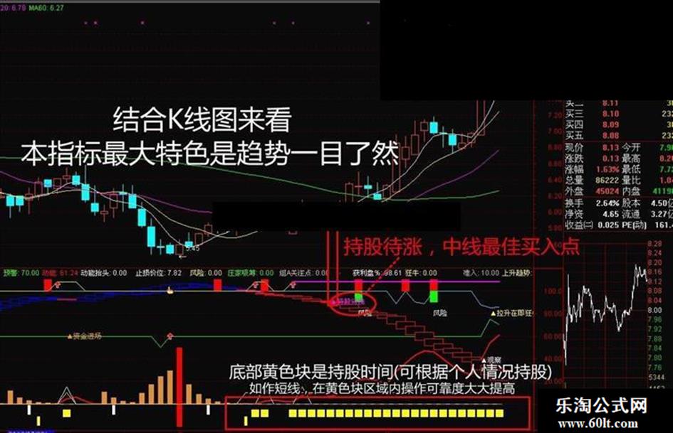 使用方法:红线框向下,趋势上涨,蓝线框向上,趋势下跌,里面有买点有好几种,自己慢慢摸索和体会,其中持股待涨最为关键,结合K线图看,必定有斩获!!