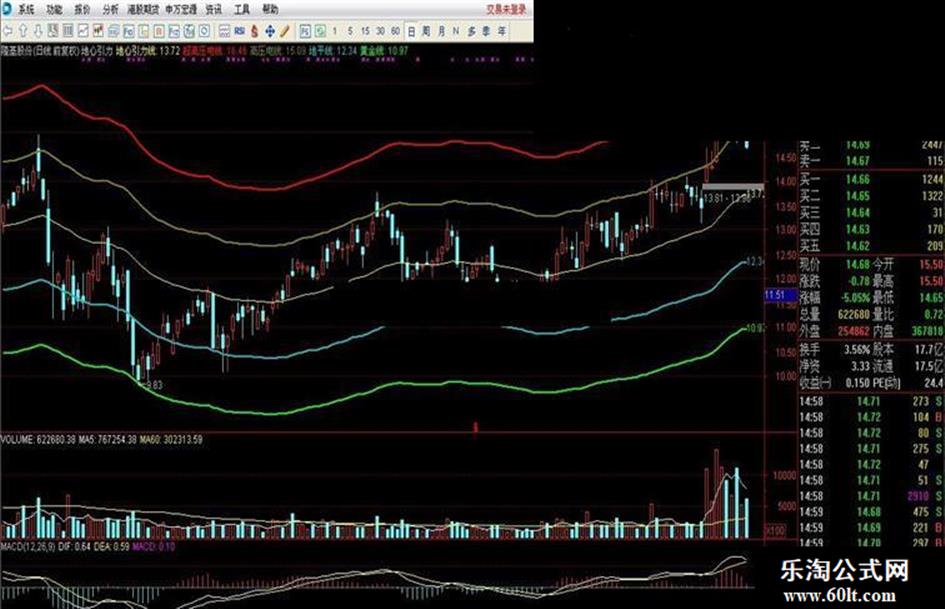 指标共五根线,中间的黄线是地心引力线,上边两根高压线和超高压线,下边两根地平线和黄金线。