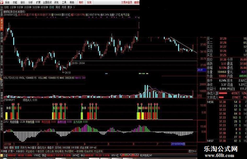 再看第二张图,为8.12选出的经典图形,主力打的非常完美。。。第一波刚刚突破就连续拉涨停,让拿着票的人爽到爆。 8.12 第二波上攻,本选股公式马上出现,如果将此公式做成股票池,你们可以在涨停前进入,主力的实力在第一波就看见了,不容置疑第二波拉升幅度了吧。。朋友们,欢呼吧,拿着此公式,基本可以爽一段时间了,并且此公式特别适合小牛行情。大盘有些许的拉升,个股就会猛攻。