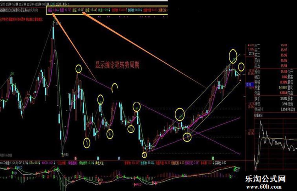 本指标可以自动划出缠中说禅 缠论笔 自动波浪 自动划线 撑压 趋势,显示转势周期等。。。。。