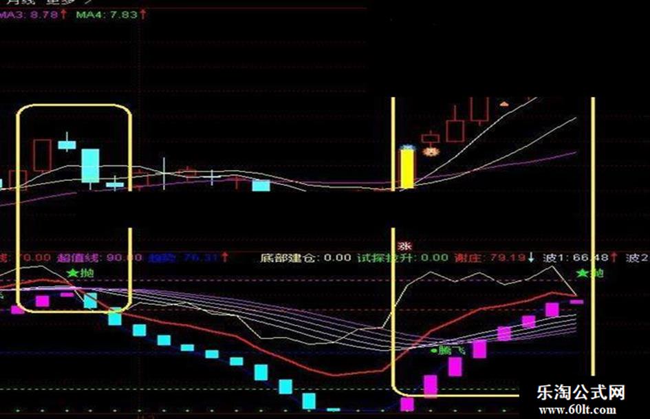 底部建仓:IF(VAR8>REF(VAR8,1),VAR8,0),COLORYELLOW,STICK,LINETHICK3;