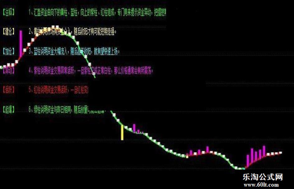 DRAWTEXT_FIX(1,0.1,0.05,0,'1、汇盈资金由向下的黄柱、蓝柱,向上的紫柱、红柱组成,专门用来提示资金异动,把握短期市场变化。'),COLOR00FF00,LINETHICK2;