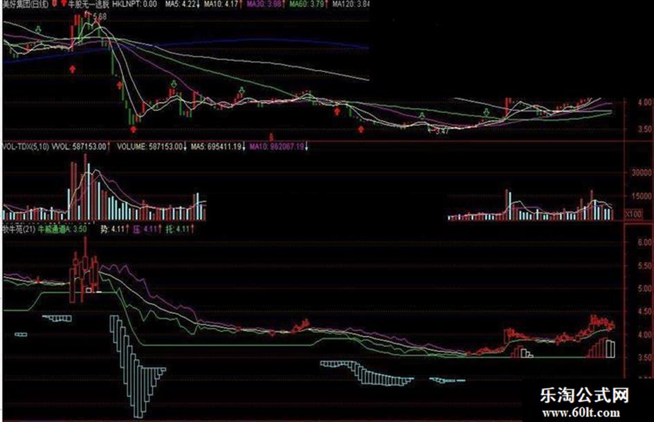 指标有一条牛熊通道A线和反映市场成本的势(黄色)压(橙色)托(绿色)的三条线组成。牛熊通道A线(简称A线)反映了市场多空牛熊的趋势,三条成本线真实的体现了市场的成本,将二者结合起来就能把握个股操作的方向和节奏。使用方法简介:1,当势压托三条线有分开状态变成重合状态成一条绿色线时,如果这条绿色线拐头向上同时A线变成红色且A线上方出现红色柱时买入;A线上方出现黄色柱是回档信号只要不破A线持股。 2,当A线上方出现白色柱时卖出;当绿色线重新分开变成三条线时立即清仓,三条线分开角度越大,下跌幅度越大。 3,当A线处于绿色且下方出现蓝色柱时持币;三线分开时持币;当三线即将重合或A线偶尔出现红色时,宜观望最好不介人。只有出现1情况时买入。指标有不完善的地方有待优化。使用方法仅供参考。
