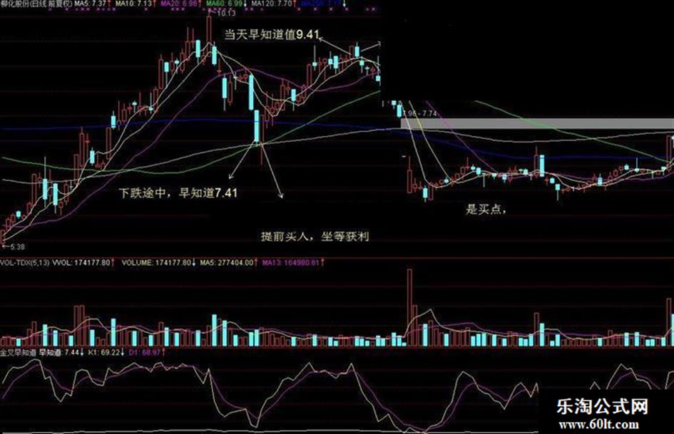 喜欢根据指标选找买卖点的朋友都想提前知道指标的金叉与死叉,下边就分享给喜欢的朋友一个这样的指标,指标加密,不喜欢的朋友请绕道,谢谢! 只适合通达信软件,无任何未来函数 用法:根据早知道的值来判断,当下跌趋势中,第二天股价盘中上穿头一天早知道的值后回踩不破早知道值时,kd指标将金叉,可结合自己的操盘技术决定是否买入; 股价在高位时,当股价跌破头一天早知道值时,分弹不能再次站稳早知道值之上,kd指标将形成死叉,可根据自己的操盘技术综合决定是否卖出;