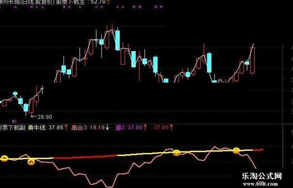 输出离合3:黄牛线-((收盘价-黄牛线)*收盘价-黄牛线)/黄牛线,线宽为2,画淡红色