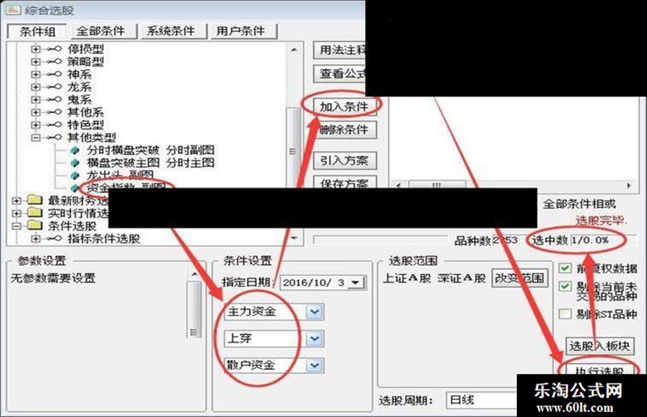 多空指数指标反应主力资金和散户资金的多空指数运行,主力资金上穿散户资金,并且散户资金向下,可以买入。通达信用综合选股器把以上两个条件组合一下,记住勾选剔除当前未交易的品种,可以快速选出所有符合条件的股票