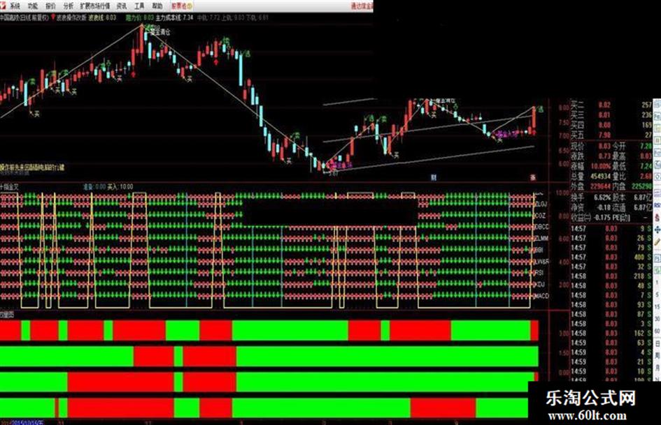 本人自用指标。1、十指金叉指标由最最经典的十项组成,MACD,KDJ,RSI,LW&R,BBI,ZLMM,DBCD,C GZ,ZLGJ,ZJL。十个经典指标以少数服从多数为原则,有7个箭头向上即发出买入信号,一个指标不可靠, 所有指标发生共振的时候趋势已经不可扭转!