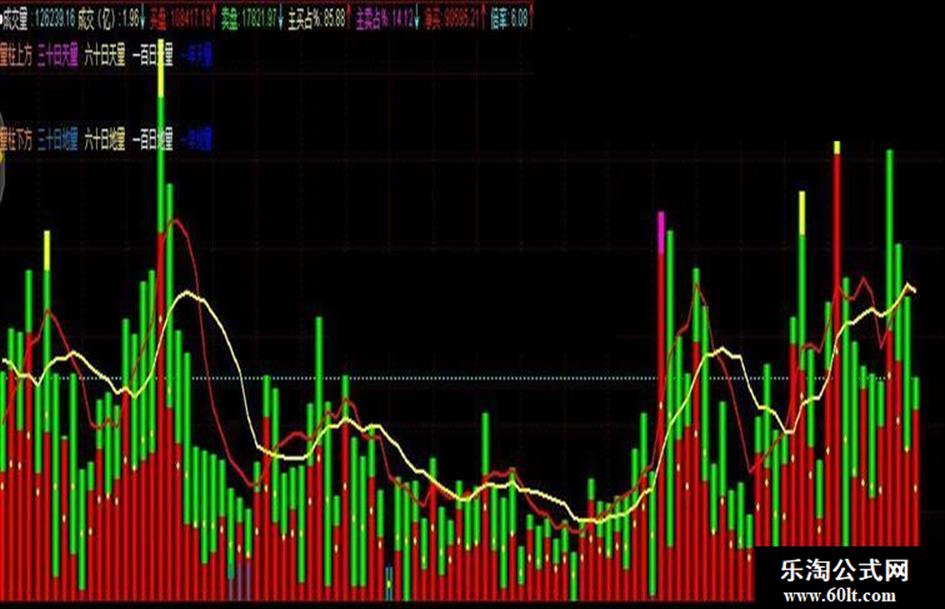 量柱下方,粉红色是三十日地量,黄色是六十日地量,绿色是一百天地量,蓝色是一年地量};
