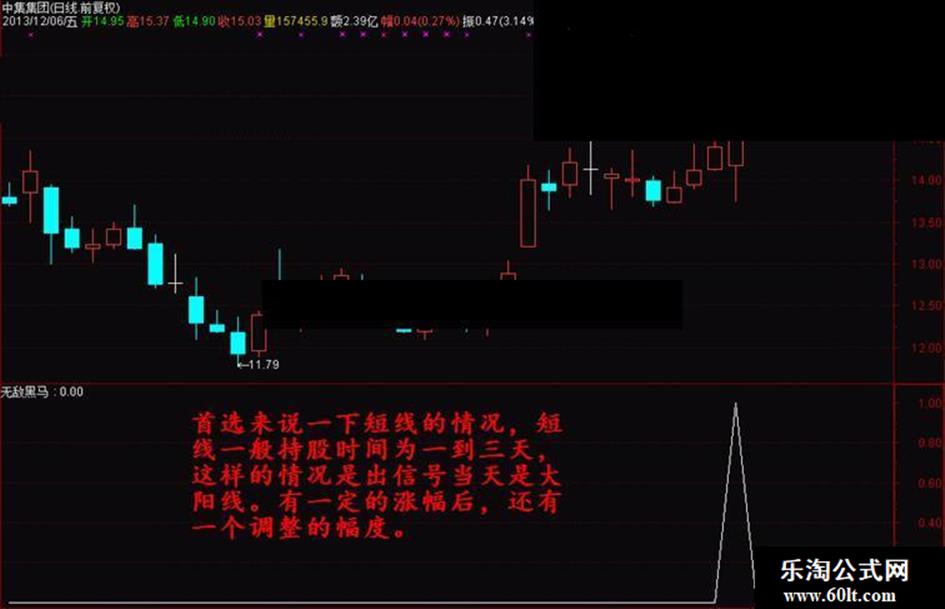 。《无敌黑马》是采用多头匀线,回调后再出选股预警。多头匀线说明股票强势,是一种常用的取势方法,一般情况下均线向上发散多头证明了庄家的存在,同是也是短线和中线启动的锲机。回落到什么样的地方才是进货的时机呢?本指标会给予你最直接、最直观、可靠的点位,提供给你分析。首选来说一下短线基本情况,短线一般持股时间为一到三天。这样的情况是出信号当天是大阳线,有一定的涨幅后,还有一个调整的幅度。如果前期有一定的跌幅,这样出的信号就非常真实,持股待涨就行了
