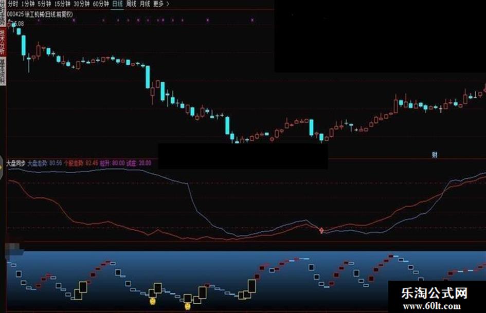 大盘K:=SMA(大盘MS,9,1);大盘D:=SMA(大盘K,3,1);J大盘:=3*大盘K-2*大盘D,COLOR1318FF;