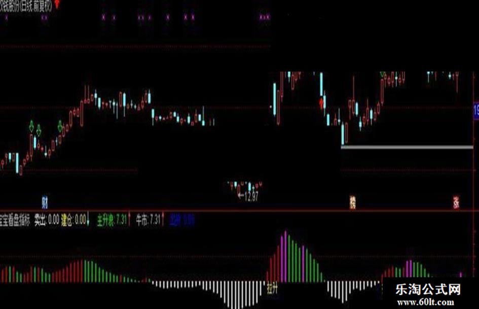 牛市:IF(VAR2>50 AND COST(85)<CLOSE AND VR>0,VR,0),COLORFF00FF,LINETHICK0;