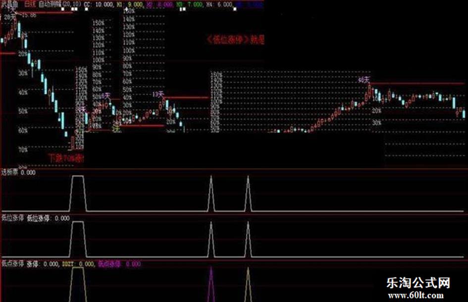 一、思路:低点涨停,首先要确定低点的性质,也就是说什么时候算是低点?这个公式俺把低点限制在20天跌幅超过50%的个股(包含跌幅50%)。一个票在20天的时间内跌幅50%,属于超跌个股,若在这个区间出现涨停,说明机构洗盘到位,基本有一波像样的反弹。如图1,第一次下跌幅度70%一个涨停,第二次下跌50%又一个涨停,这两个低点都有一次不错的反弹机会。