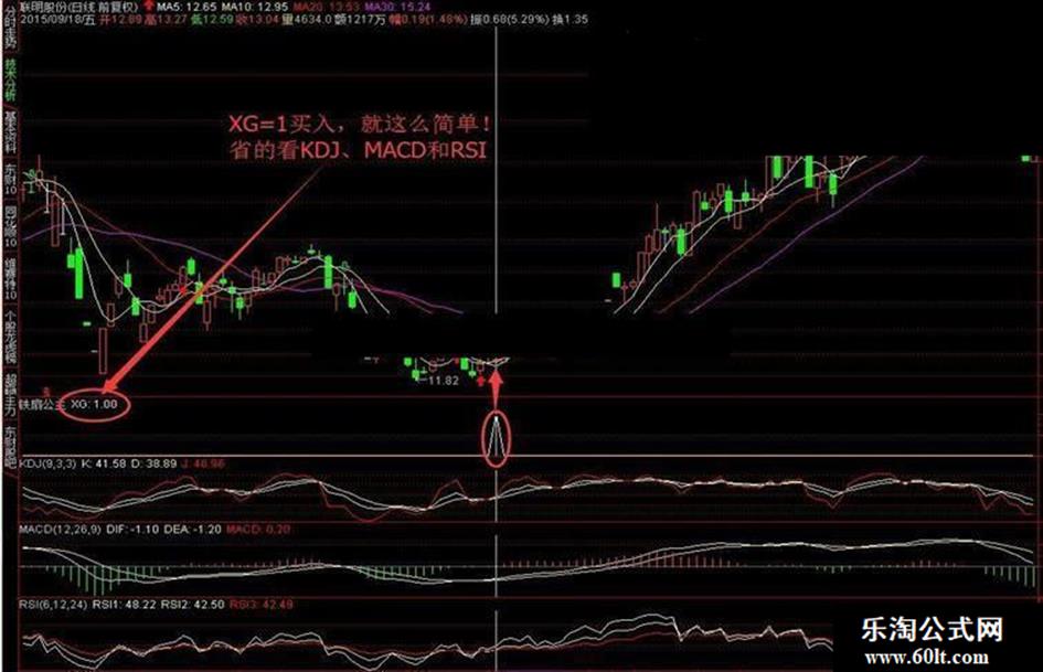 XG:CROSS(J,D) AND COUNT(CROSS(DIF,DEA),5)>0 AND COUNT(CROSS(RSI1,RSI2) AND RSI2>REF(RSI2,1),5)>0 AND