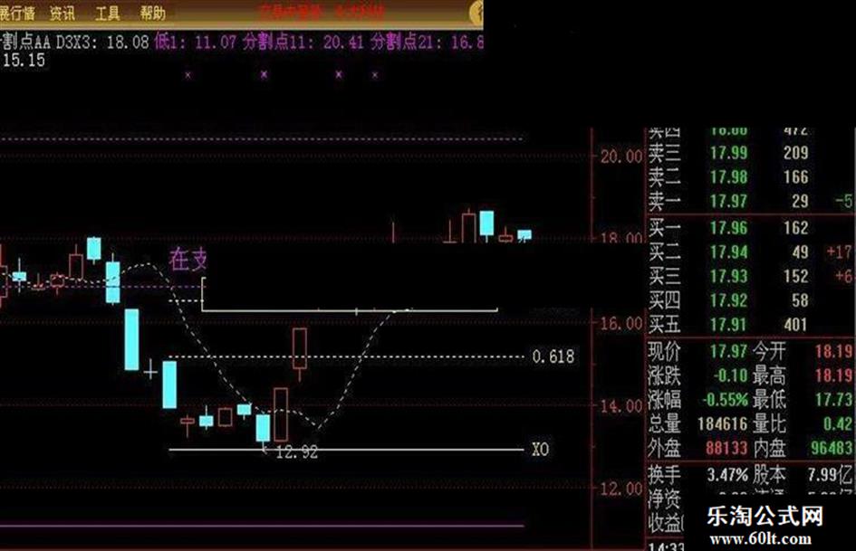 分割点1:IF(CURRBARSCOUNT<=20,高-(高-低)*0.382,DRAWNULL),COLORWHITE,DOTLINE;