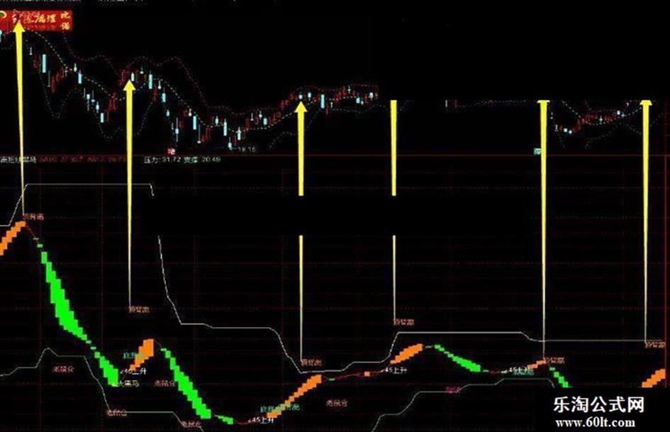 支撑:MA(REF(LLV(C,30),1),2),COLORABFF46; AA1:=AMOUNT/V;BB1:=L<AA1*0.9;