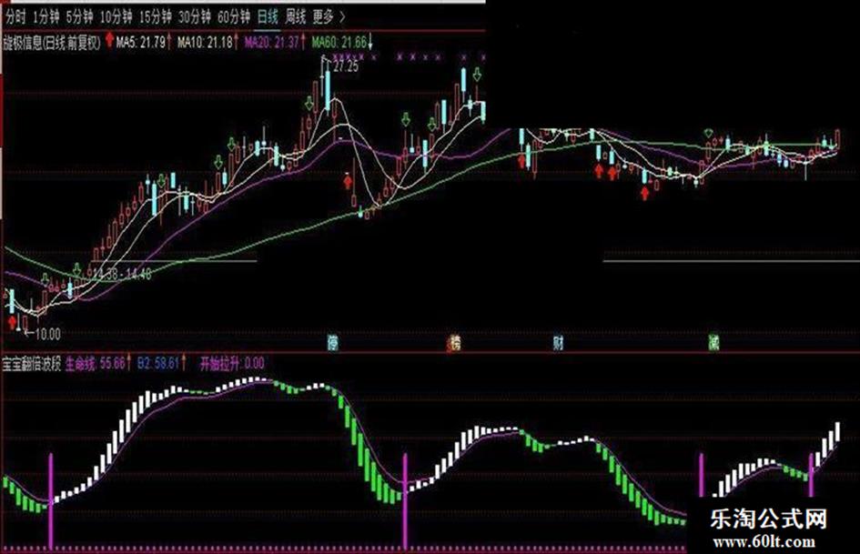 开始拉升:IF(CROSS(VARC,生命线) AND VARC>VARD AND VARC<55 AND C>O,50,0),COLORFF00FF,STICK,LINETHICK4;