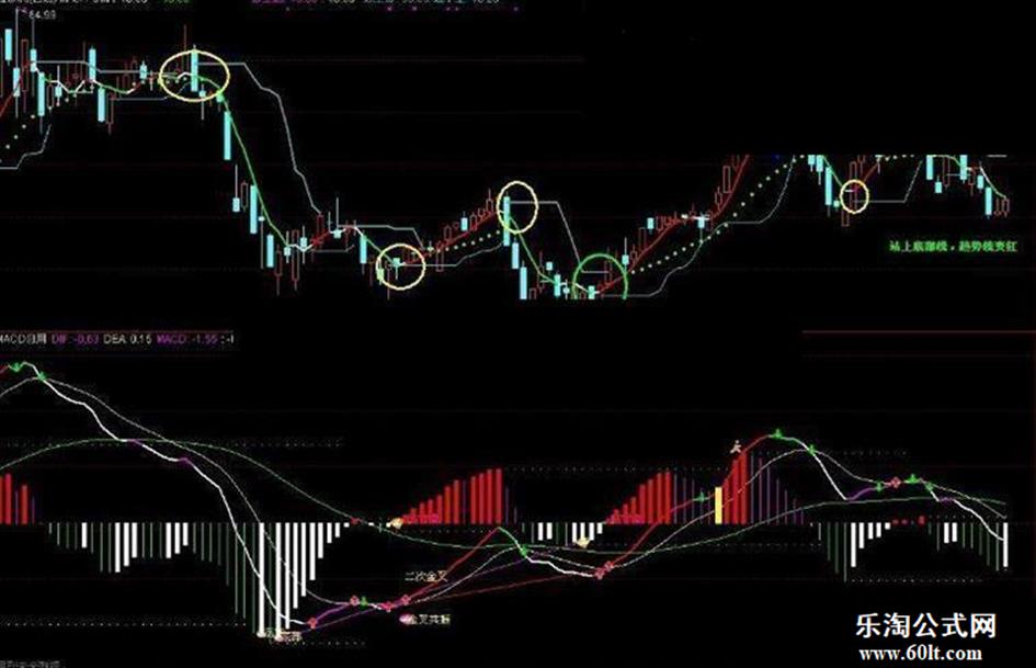 降:=HHV(EMA(C,3),8),COLORCYAN; 升:=LLV(EMA(C,3),8),COLORRED;走势:=EMA(C,3),COLORYELLOW;