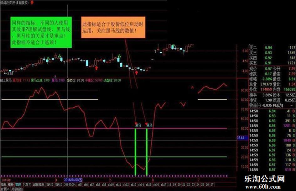 黑马出现:IF(CROSS(黑马线,9),50,0),STICK,LINETHICK6,COLOR00FF00,COLORGREEN;