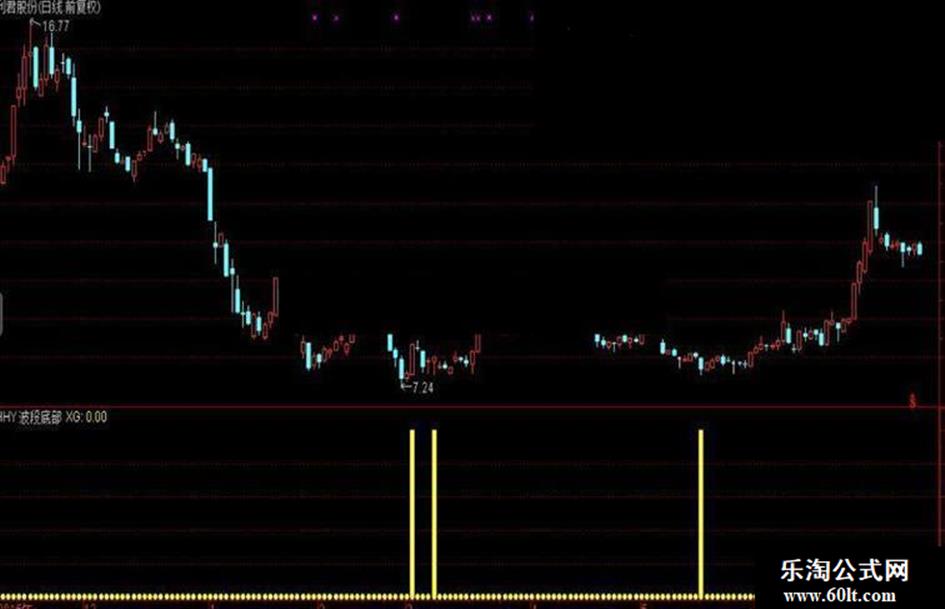 N:=90;M:=3; 低:=REF(LLV(L,N),M); 低点:=REFDATE(低,DATE); XG:低点=L AND ((C-L)>(0-C) OR (O-L)>(C-O)) COLORYELLOW,LINETHICK5,STICK;