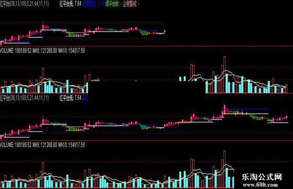红平台低:IF(IF(KUD=0,C>REF(C,1),REF(C,KUD)>REF(REF(C,1),KUD)),IF(KUD=0,L,REF(L,KUD)),DRAWNULL),POINTDOT,COLORWHITE;