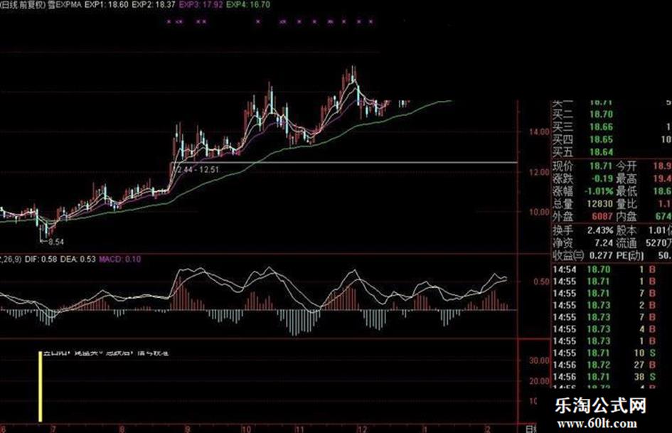 AA6:=(主买1-(-主卖1))/主买1;STICKLINE(大底>0 AND C<O ,0,CC,4,0),COLORYELLOW;DRAWTEXT(大底>0 AND C<O,CC,'*翌日阳,尾盘买。急跌后,信号较准');