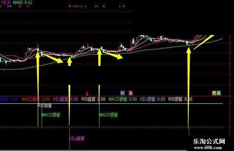 RSI底背:IF(B3>0,-50,0),COLORYELLOW,POINTDOT;