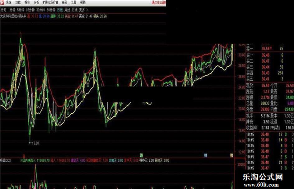 领头:IF(CROSS(趋势,高),高*1.01,低),COLOR00FFFF,LINETHICK2;