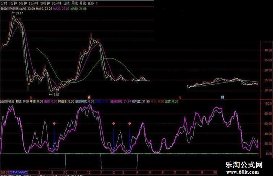 短线投机:EMA((CLOSE-LLV(CLOSE,55))/(HHV(CLOSE,55)-LLV(LOW,55))*100,5),LINETHICK2,COLORFF00FF;